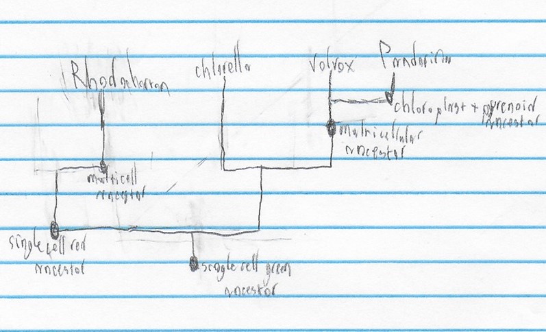 There are multiple differences between each genus as seen in the previous paragraph. Single-celled creatures came before multicellular ones in the evolutionary chain, but there is also a difference in types of algae color or chloroplast types thus it is possible that the multicellular genetic mutated twice in different lines. The first split from a single-cell ancestor was one genus that became red algae while the other green. The red line later mutated into becoming multicellular leading to Rhodochorton. On the green algae line, a split occurred between genus that stayed single-cellular leading to Chlorella, and genus that mutated into becoming multicellular. The multicellular ancestor eventually split again into one with just a chloroplast, Volvox, and genus that evolved a compartment in the Chloroplast called the pyrenoid which leads to the genus Pandorina.