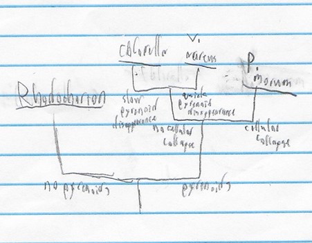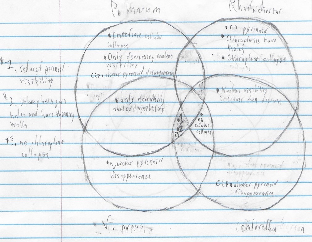 As the cells died, they were studied to show the eventual affects every few days. The main affects studied was the presence of a nucleus, holes and/or thinning of the chloroplasts or even its collapse, whether the green algae’s pyrenoids were visible, and whether the cell itself has collapsed yet. Each cell type also had an ongoing test of how they reacted in conditions of present or absent oxygen levels in the water. For each cell type, the oxygen did not change the ordered pattern of what breaks down first per cell type, however, some individual processes took either slightly longer or sometimes slightly faster for chloroplast holes and collapse respectfully. Besides the slight speed differences, each species held a pattern of decay.